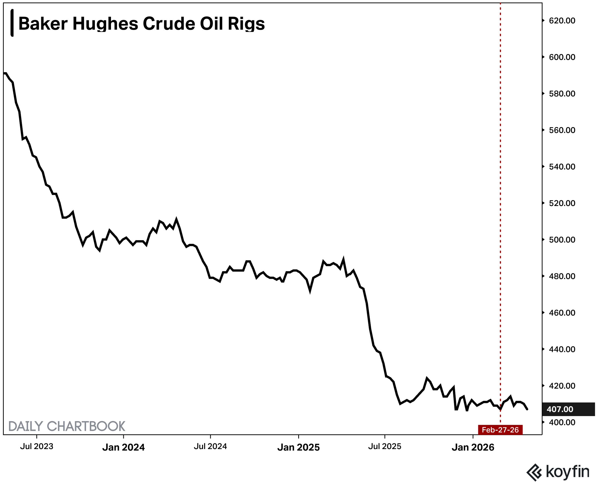 2. US crude oil rigs. The US crude oil rig count fell by 3 to 407 in the week ending Apr 24. That matches the count at the start of the war on Feb 27.