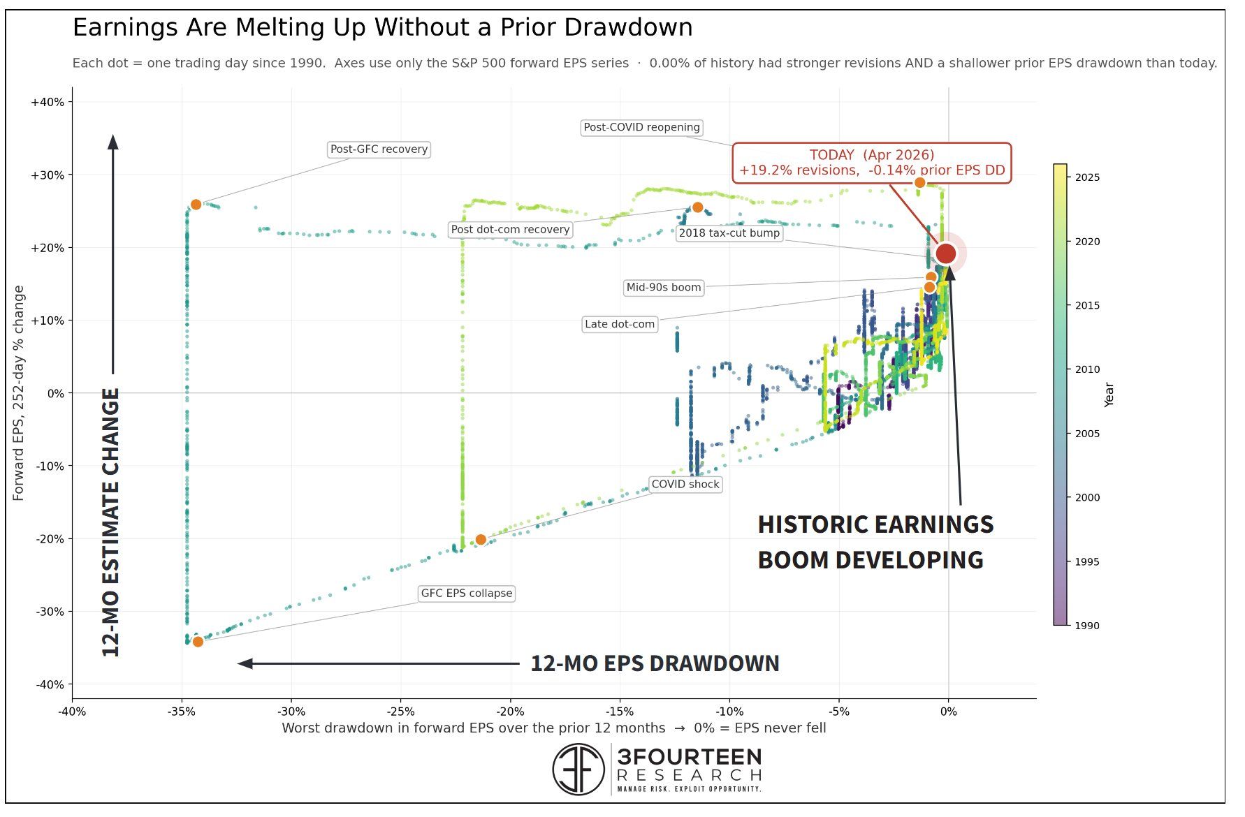 4. EPS revisions vs. drawdowns. "A historic earnings boom is developing. Estimates growing faster than they did in the mid-90s or late internet bubble years. Only covid recovery period saw a greater inflection. This boom is unique b/c it is not coming off an EPS drawdown (recovery)."
