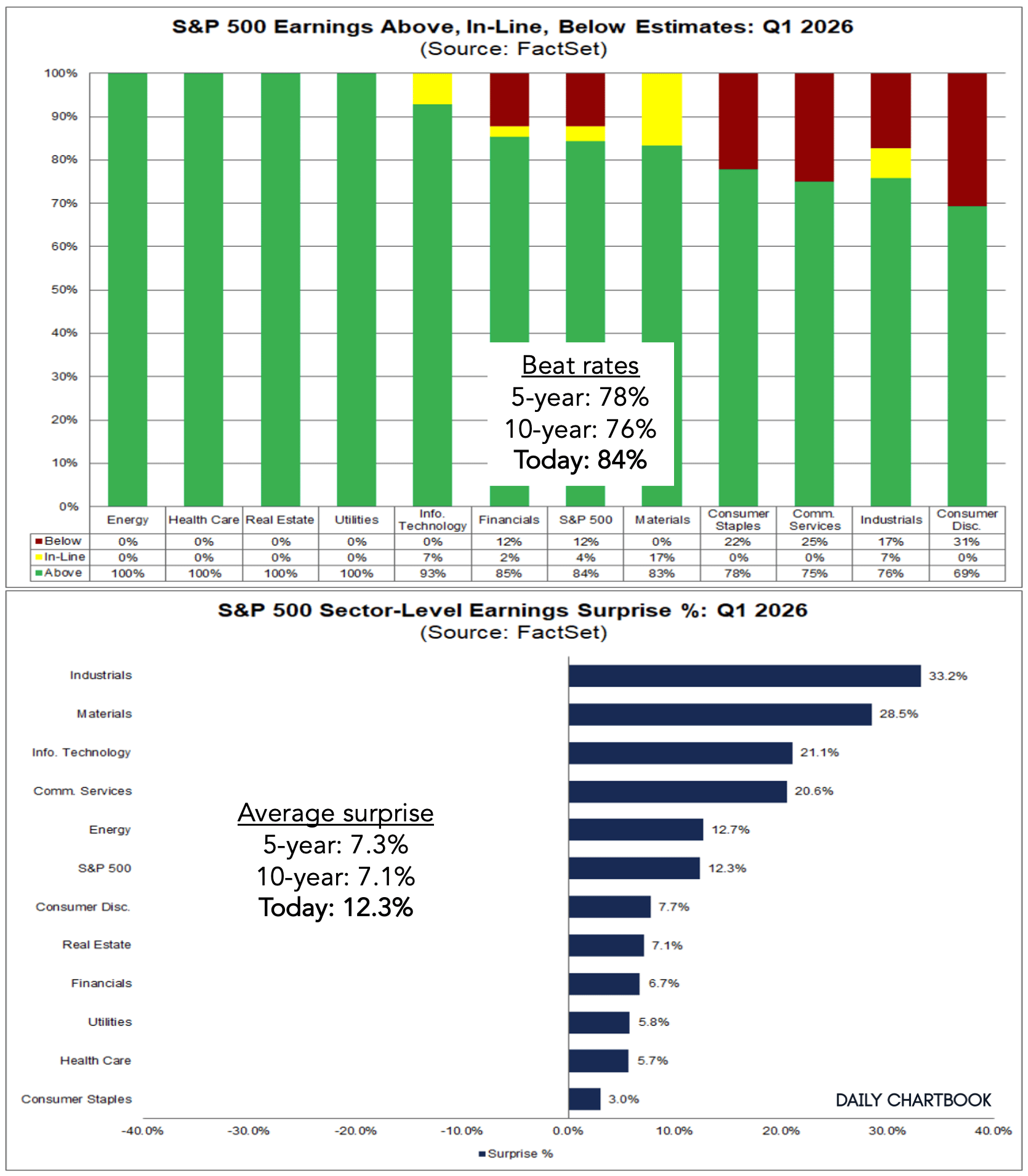 5. Q1 earnings. 84% of companies have delivered higher-than-expected EPS. This is above the 5- and 10-year averages. In aggregate, companies are reporting EPS that are 12.3% above estimates. This is also higher than the 5- and 10-year averages.