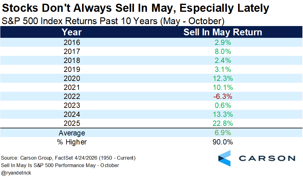 3. Seasonality. "Yes, the worst six months are coming up soon (May - October). But these six months have been lower only once the past decade and last year was the greatest Sell in May return ever (+22.8%). We are expecting another strong return this year."