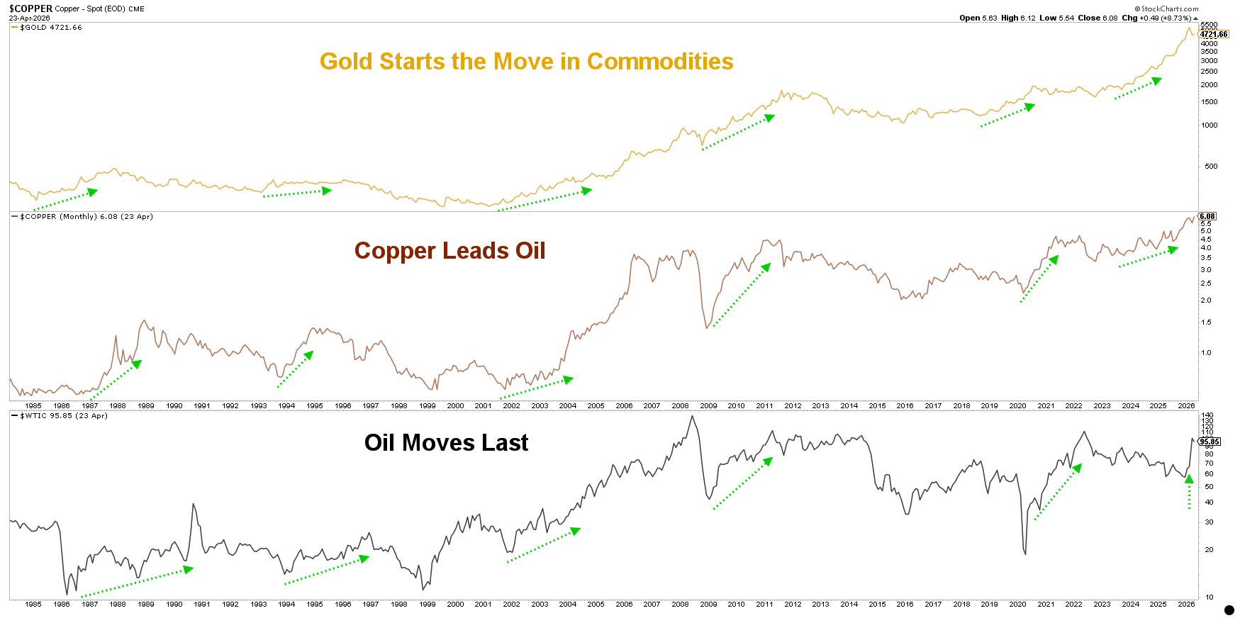 1. Gold vs. copper vs. oil. "What does the world look like if oil prices are hitting new all time highs just like gold and copper did recently?"