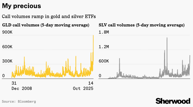 2. Precious metals ETFs. "The five-day average for call volumes in GLD recently hit a record, while those for its silver peer are at their highest since 2021."