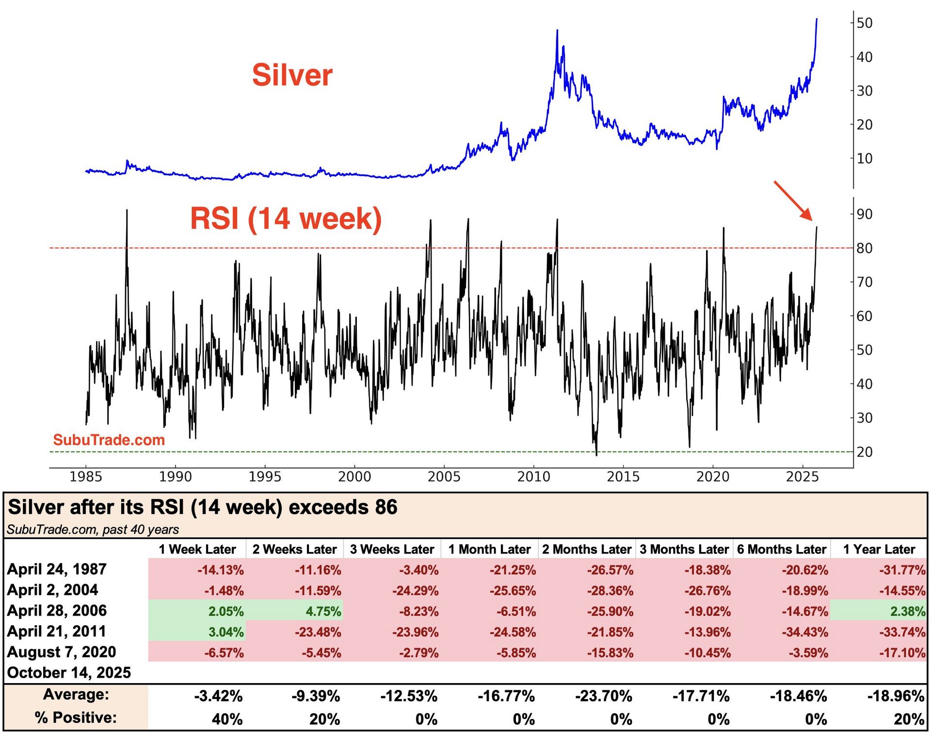 3. Silver RSI. "Silver's weekly RSI is at 86, one of the highest readings ever. Here's what silver did after similar spikes."