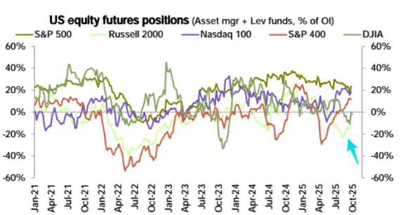 4. Equity futures positioning. "Russell is the main outlier when it comes to US equity positioning among asset managers and leveraged funds."