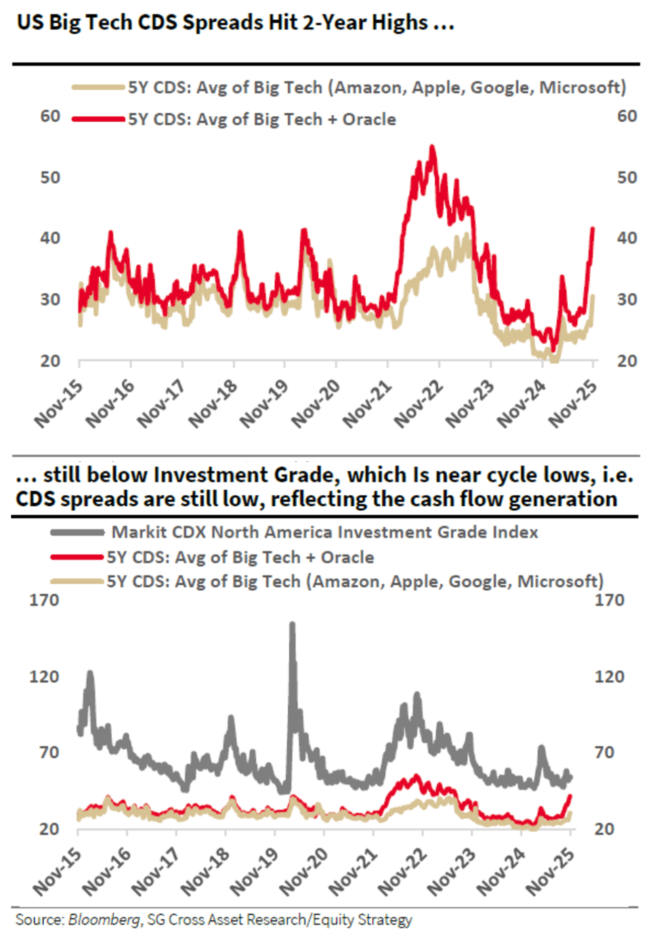 5. Big Tech CDS. "The Big Tech CDS has surged this year with Oracle CDS leading the rise. The big Tech CDS is now highest in over 2 years, rising from cycle-lows. While the standalone chart show concerns, when compared with the broader IG market, the spreads are still below the aggregate Investment Grade credit and that the IG CDS is still near cycle lows."