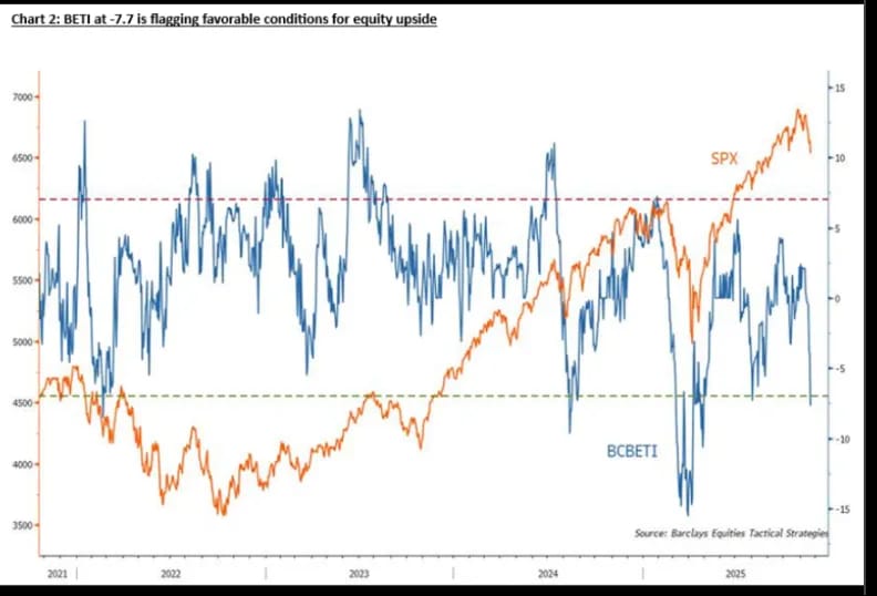 2. Barclays Equities Timing Indicator. BETI "fell below -7 for the first time since Aug. 4 ... The index has returned an average of 6.6% over the following 42 days and posted median gain of 5.1% with a 90% hit rate since 2015 when BETI drops to between -7 and -8."