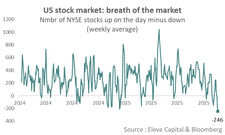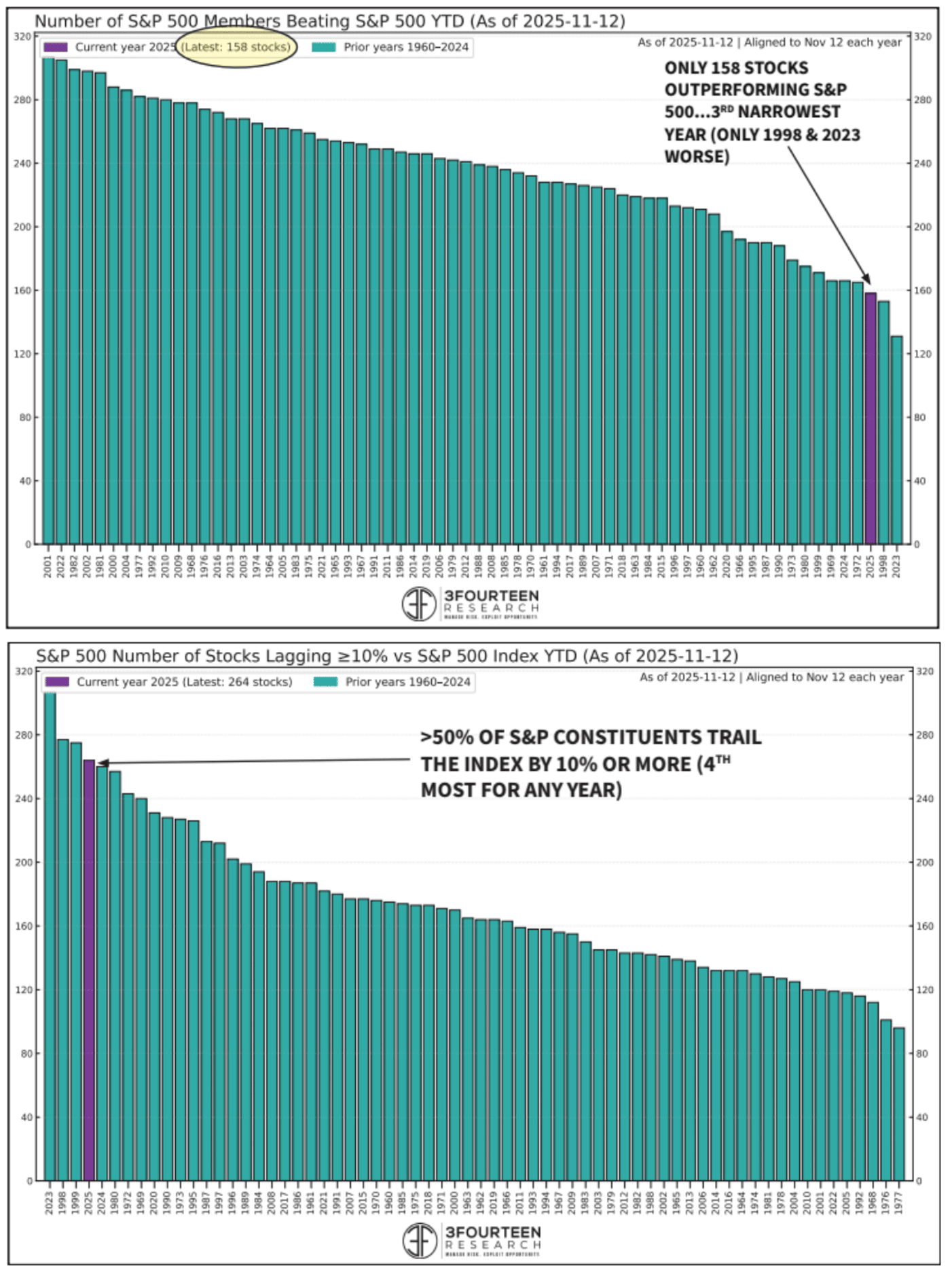 3. Narrow rally. The number of SPX stocks outperforming the index is the third-lowest since 1960. The share trailing by at least 10% is the fourth-most.