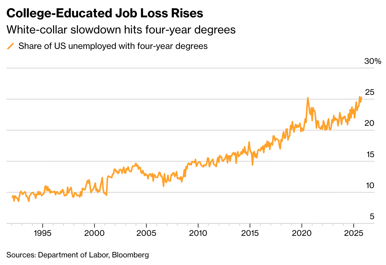 1. College-educated unemployment. "Americans with four-year college degrees now comprise a record 25% of total unemployment, underscoring a sharp slowdown in white-collar hiring this year."