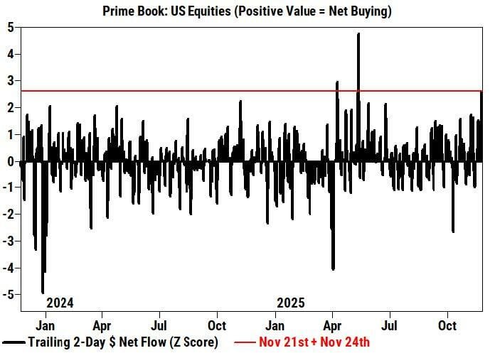 4. Hedge fund flows. "Coming into Tuesday's session hedge fund buying was the largest over any two-day period in more than six months and one of the largest in the past two years."