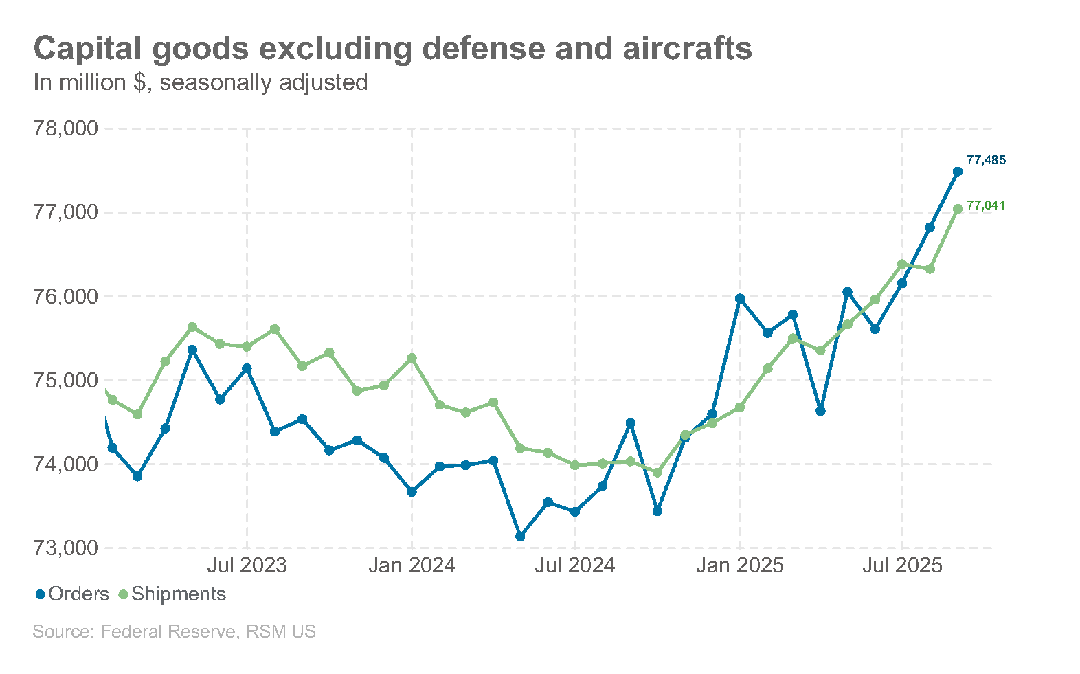 2. Durable goods. "The worst of business uncertainty caused by tariffs is most likely behind us ... Orders for core capital spending, which excludes aircraft and defense, rose by 0.9% on the month, capping off a great quarter at a 7.6% growth rate on a three-month annualized pace."