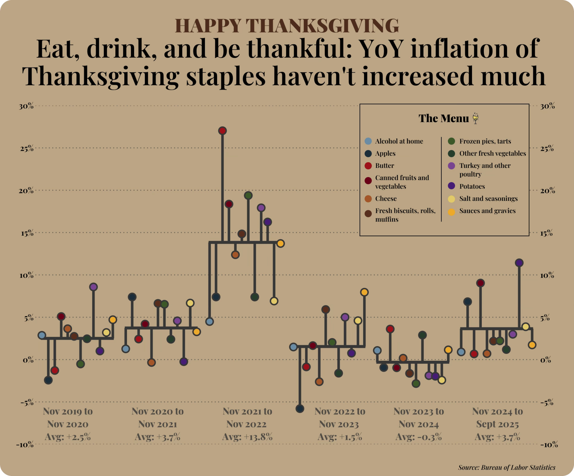 1. Turkey Day inflation. "I pulled the price changes for 12 Thanksgiving staples typically served around the table. Think turkey, potatoes, alcohol… the essentials ... the cost of the Thanksgiving basics has increased at about the same pace as headline inflation."