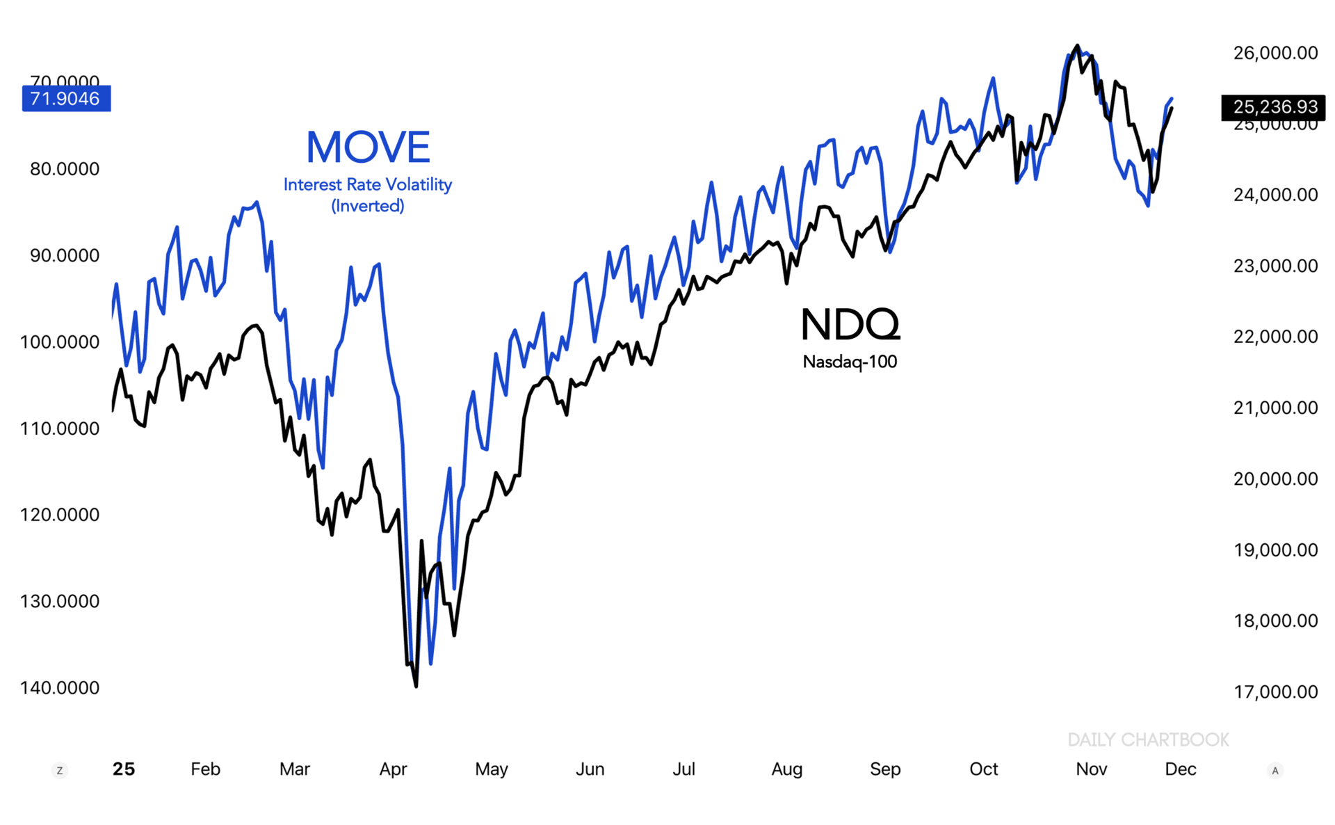 5. MOVE vs. NDQ. Interest rate volatility has rolled over (MOVE inverted) and stocks are rallying in kind.