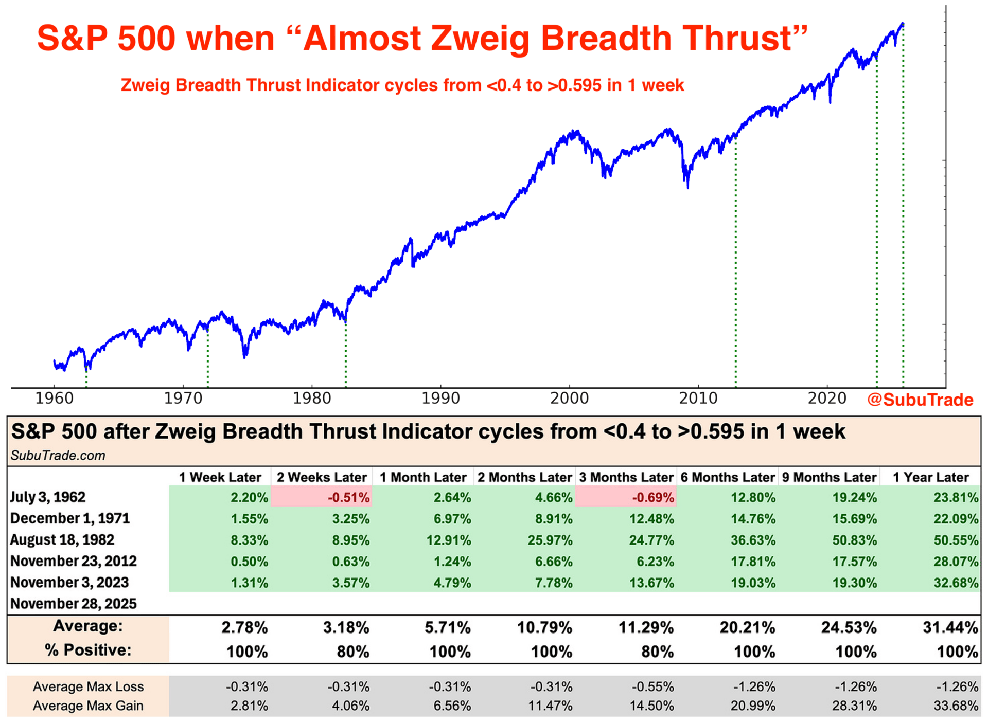 5. Almost ZBT. "Even 'almost' triggering a Zweig Breadth Thrust is a bullish sign for stocks."