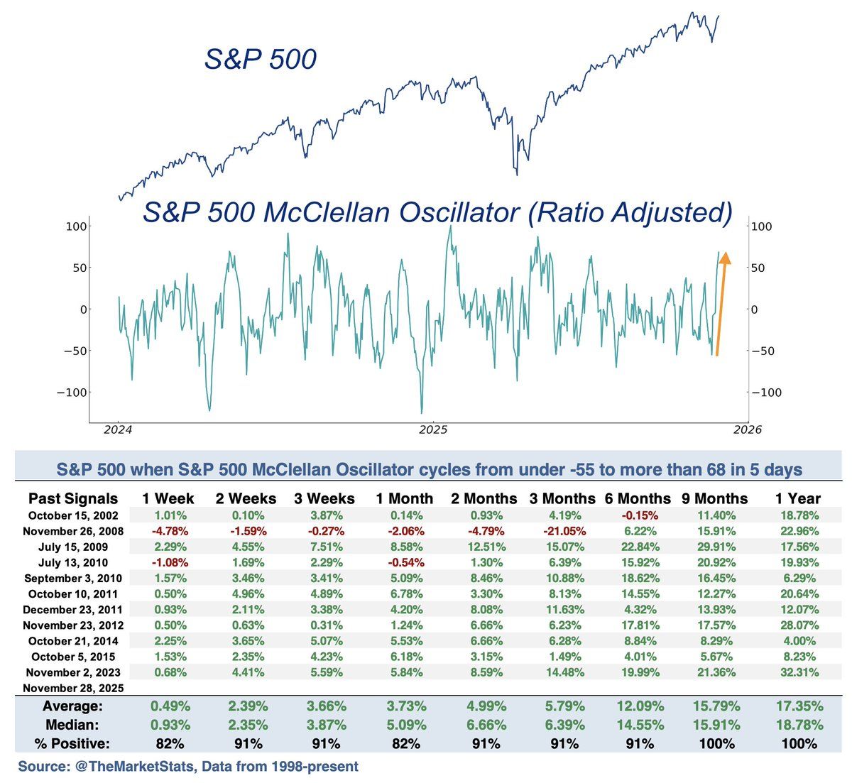 4. SPX vs. McClellan Oscillator. "$SPX is up 5 straight days [thru 11/28], and its McClellan Oscillator cycled from -55 to +68 in just 1 week. Here's what happened next to $SPX after similar historical rallies."