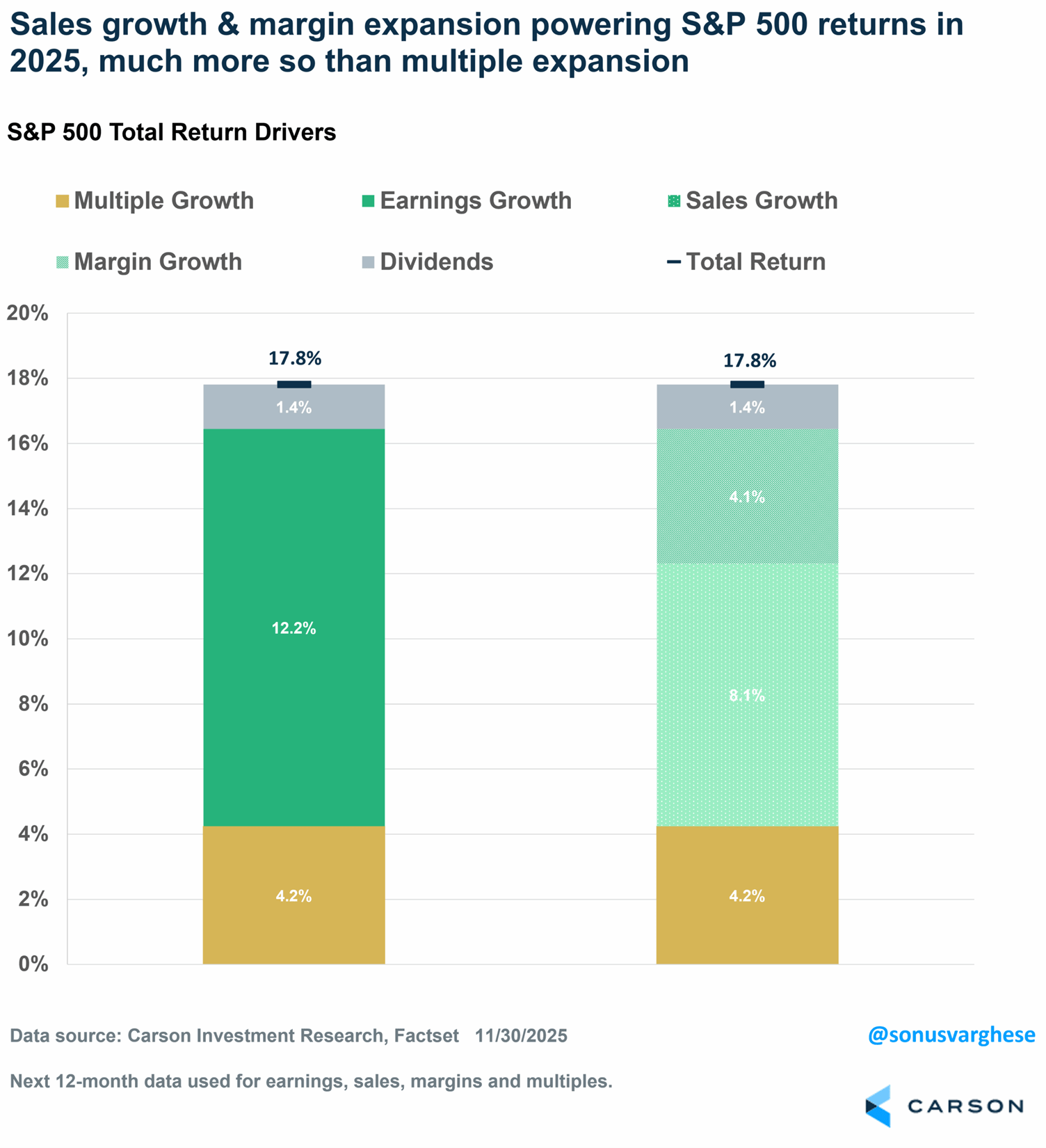 5. Return drivers. The S&P 500's returns in 2025 have been powered mostly by earnings (sales + margin growth), with some multiple expansion.