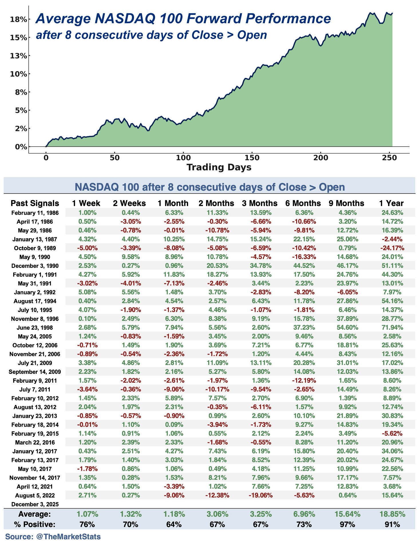 4. Nasdaq-100 streak. "NASDAQ 100 Closed higher than its Open for 8 consecutive days. Similar cases saw the NASDAQ rally 32 out of 33 times 9 months later, with an average gain of 15.6%."