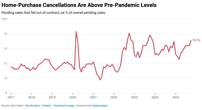1. Cold feet. In October, 15.1% (~53k) of home-purchase agreements were canceled, the highest share since November 2023 and up from 14.3% a year earlier.