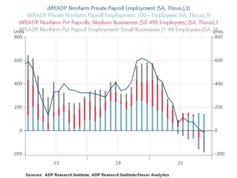 2. ADP. "Private payrolls negative over the last three months … Over the last three months, small business have cut 178,000 off their payroll ranks. By contrast, large firms have added 143,000."