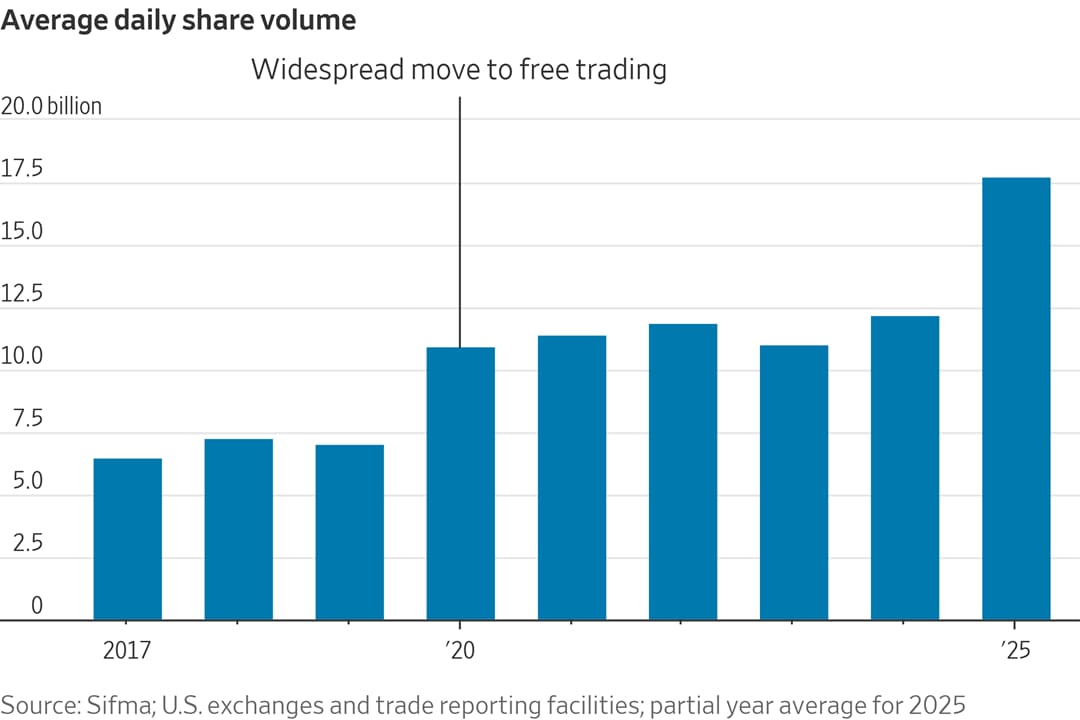 3. Average daily share volume. "Average daily share volume on and off U.S. exchanges has nearly tripled since 2017 and is up by a lot more than that in dollar terms."