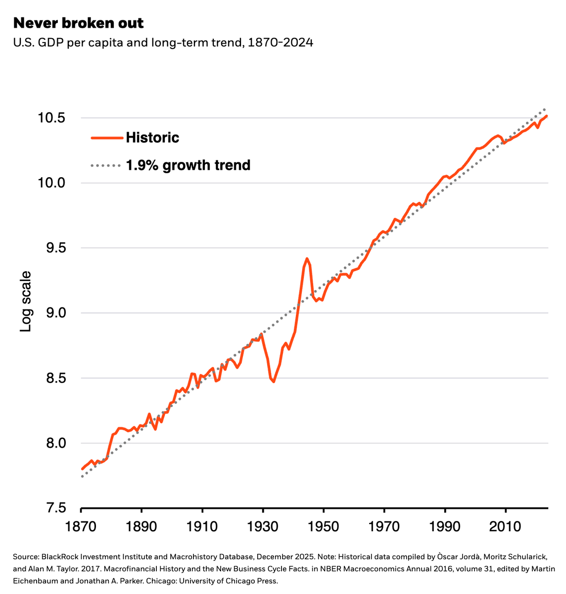 5. Tech vs. GDP. "All major innovations of the past 150 years – steam, electricity and the digital revolution – were enough to keep U.S. growth at its 2% trend, not break it ... Something more is needed, and AI could deliver it."