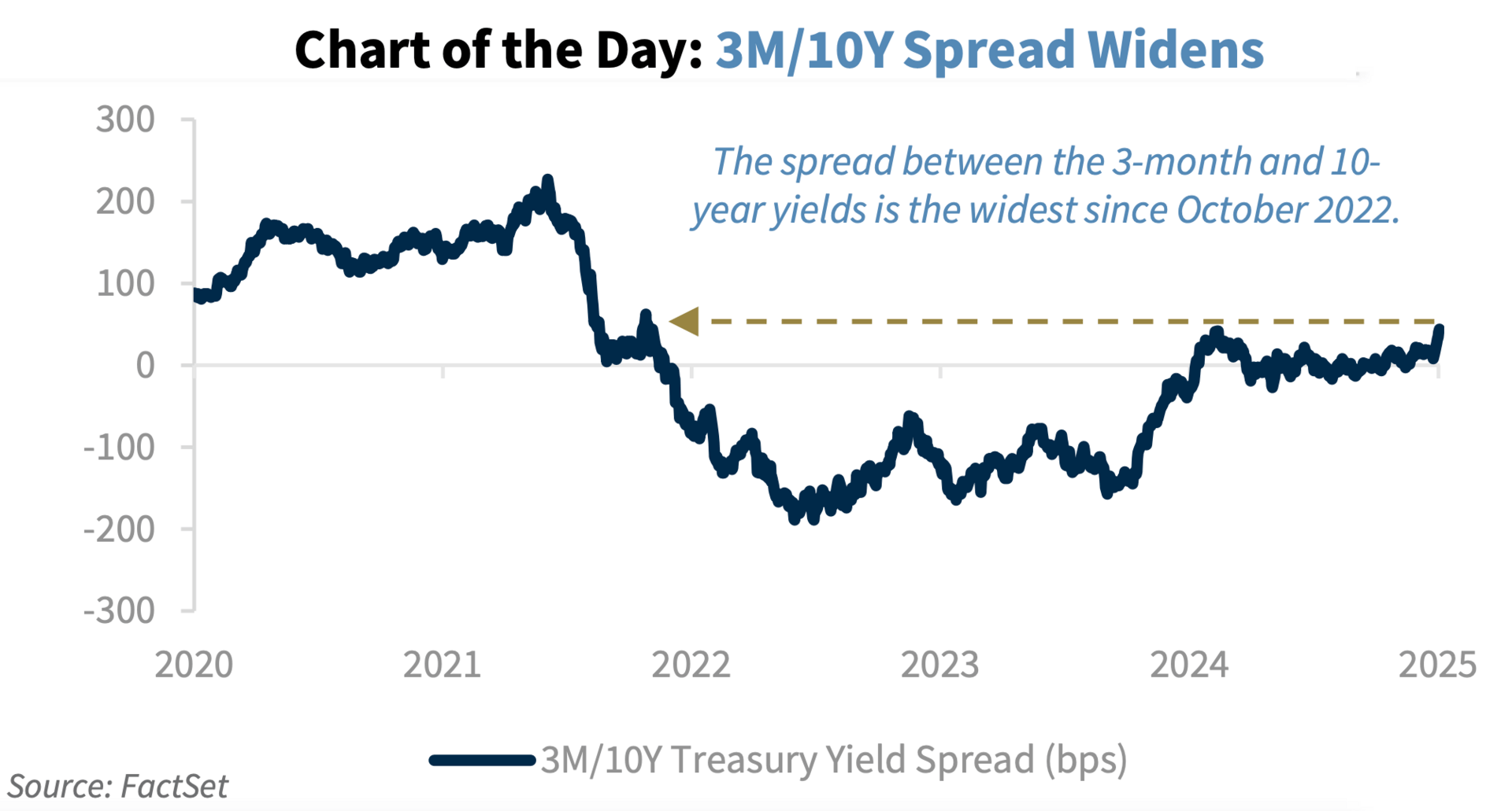 2. Yield curve. "The Treasury curve continues to steepen, with the spread between the 3-month and 10-year yields at its widest level, 58 bps, since Oct. 2022."