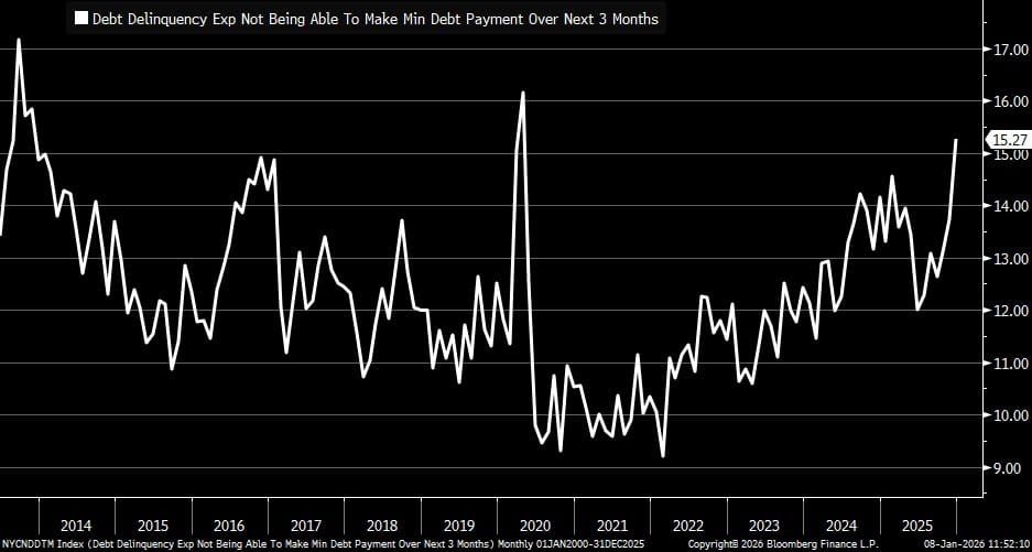 1. Survey of Consumer Expectations. "More stress: % of consumers thinking they won't be able to make a minimum debt payment in the next 3 months rose sharply in December to 15.27% ... that is a new post-pandemic high."