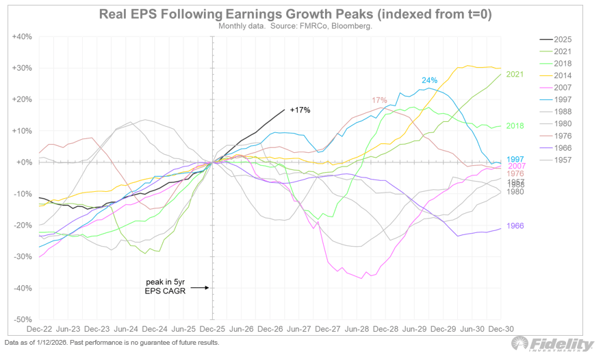 5. Peak earnings. And finally, "peak earnings growth and peak earnings are not always the same thing. Current estimates, suggest earnings could continue to advance higher by 17% over the next 5 quarters. If true, that will be the strongest continuation of earnings growth following a peak ever. Only the 1997 growth peak comes close."