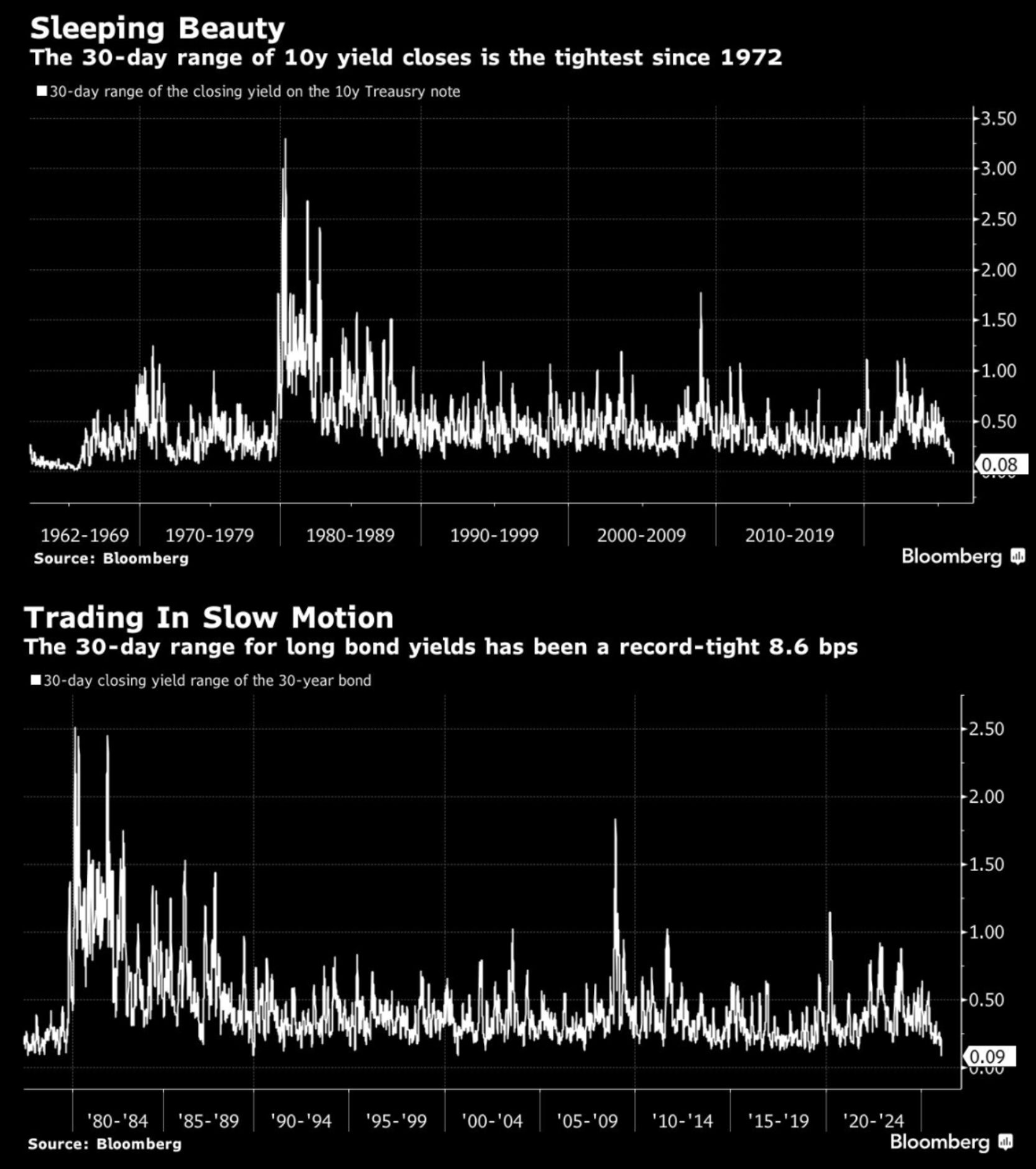 3. Bond market calm. "The bond market has never been so quiet ... the 30-day trading range for the benchmark 10-year US Treasury, which is now the tightest it’s been since the 1970s. Meanwhile, the trading range for the 30-year has reached a record low."