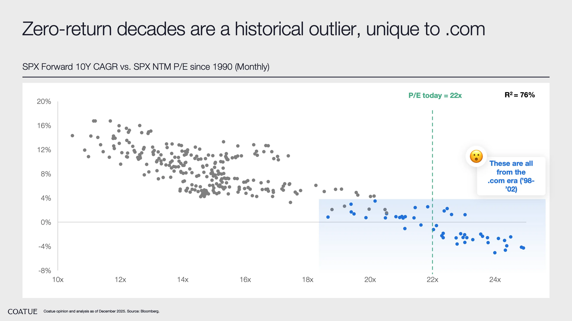 5. Valuation vs. profitability. "The scatter plot below shows the forward P/E multiple against forward net margins for the S&P 500 index, broken into four-year intervals going back to 2005. The relationship is remarkably consistent: as margins expand, multiples drift higher."