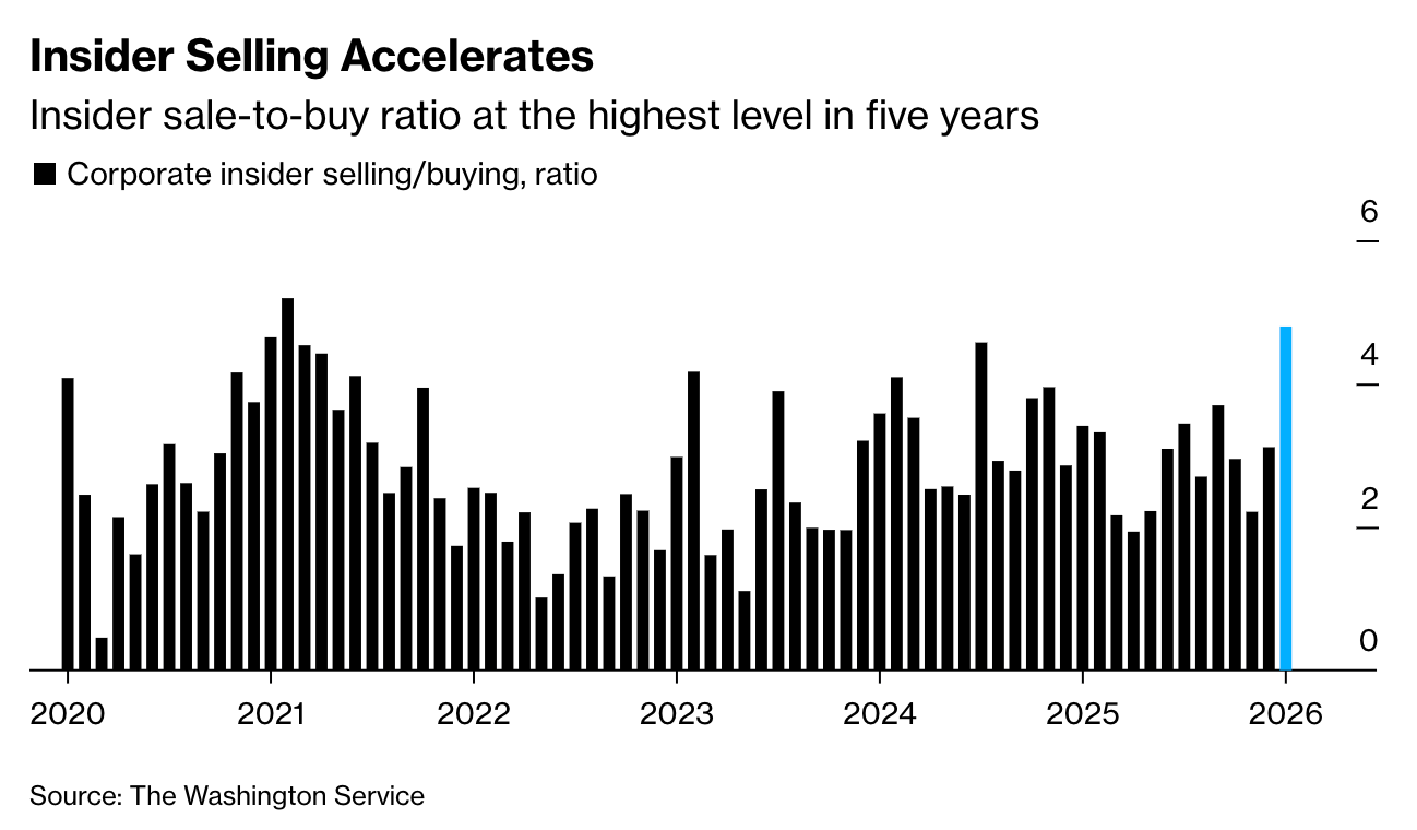 4. Insider activity. “Almost 1000 executives at roughly 6,000 US-listed firms have unloaded shares this month, compared with 207 who added, resulting in the highest sell-to-buy ratio in five years”.