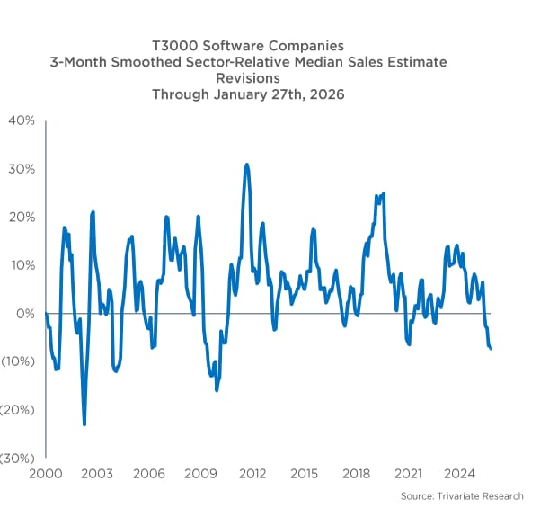 5. Software earnings revisions. “Many software companies have been revising their expectations for future revenue and earnings down. In fact, according to Trivariate, we haven’t seen this much downward revision to the median software company’s sales estimate relative to the broader tech sector since the 2009 financial crisis.”