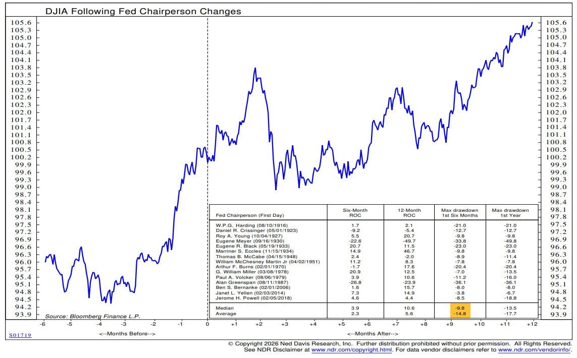 3. SPX vs. new Fed chair. “Markets tend to test new Fed chairs. The average correction in the first six months is 15%. When the chair faces their first crisis, investors don’t wait and see how they handle it. Fed independence is a potential crisis for Warsh but it could be anything.”