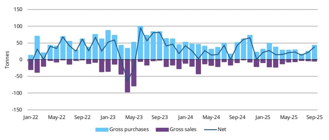 3. Central banks vs. gold. "Central banks' reported net purchases of gold totalled 39 tonnes in September. This buying was up 79% m/m and is the highest month of reported net buying in 2025 so far."