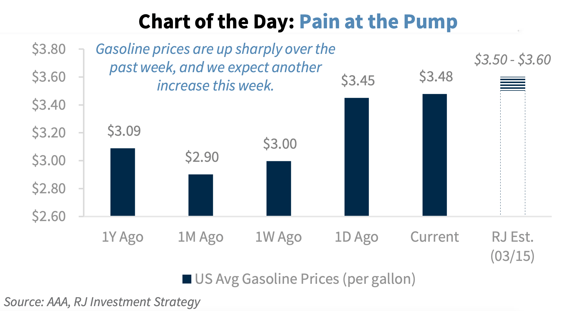 2. Gas prices. "Gasoline typically rises by $0.25/gallon for every $10/barrel increase in oil. Oil is up by $21 since the Iran conflict began, which suggests that gasoline's national average is set to rise by a total of $0.50-$0.60 once oil prices fully flow through the supply chain."