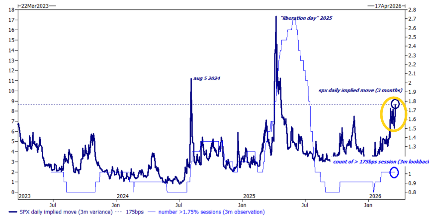 3. SPX implied moves. "The SPX is pricing a 175bps daily move every session from now until June expiry ... for context we have seen exactly two sessions where the daily move in SPX was >175bps since christmas ... i don't think the average trader's anxiety can handle 66 of those straight."