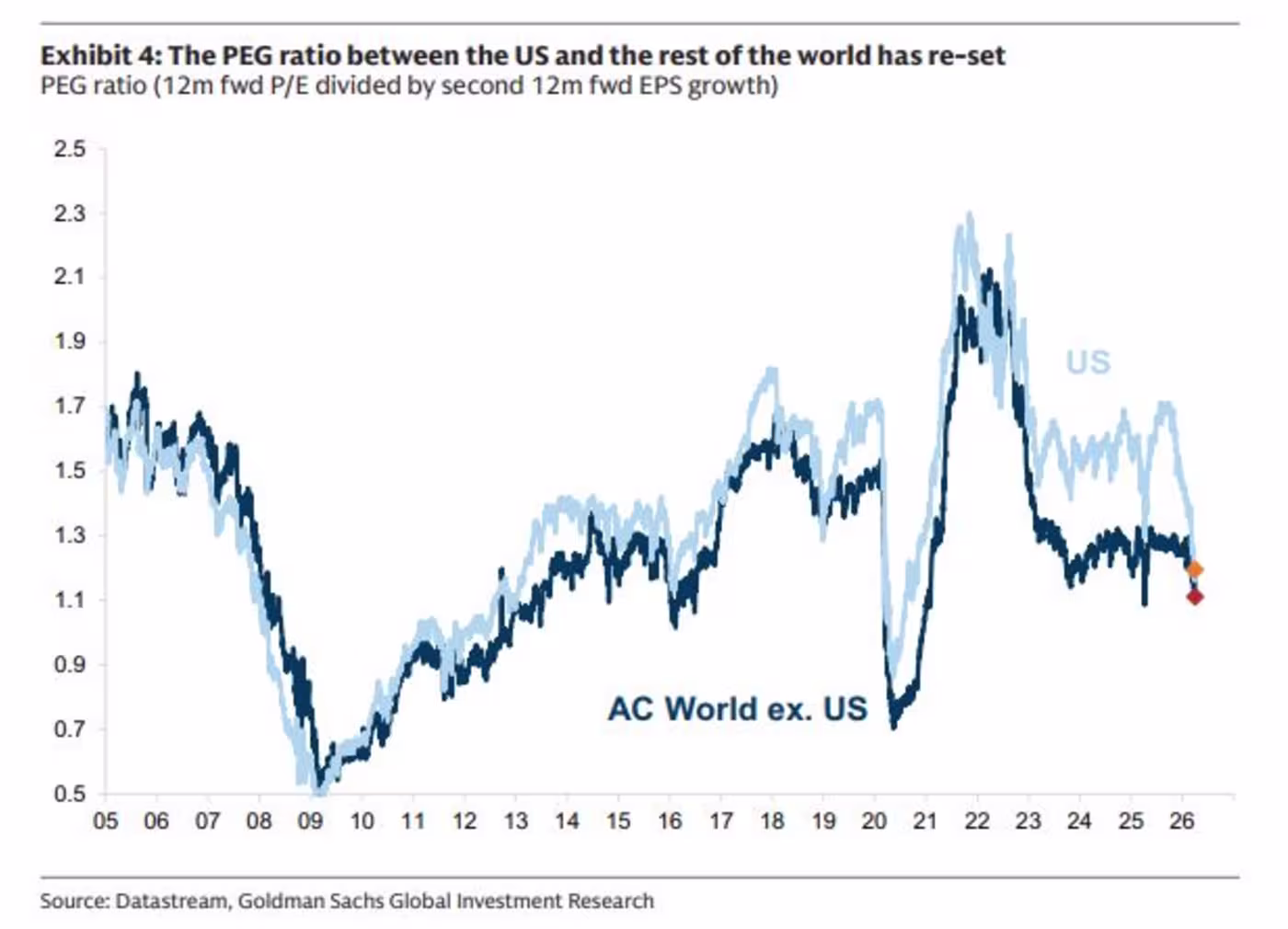 5. US vs. RoW. "The PEG ratio between the US and the rest of the world has re-set".